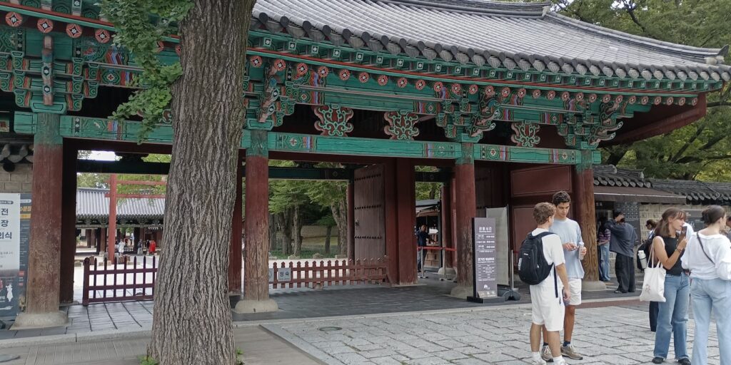 李氏朝鮮に縁のある全州市、慶基殿の入口にて。建物に塗られた青と赤が印象に残った。
