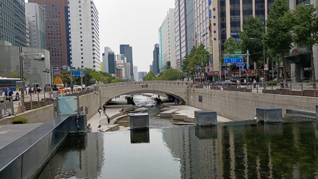 ⇑上を走っていた高速道路が取り除かれた、青渓川の清流。