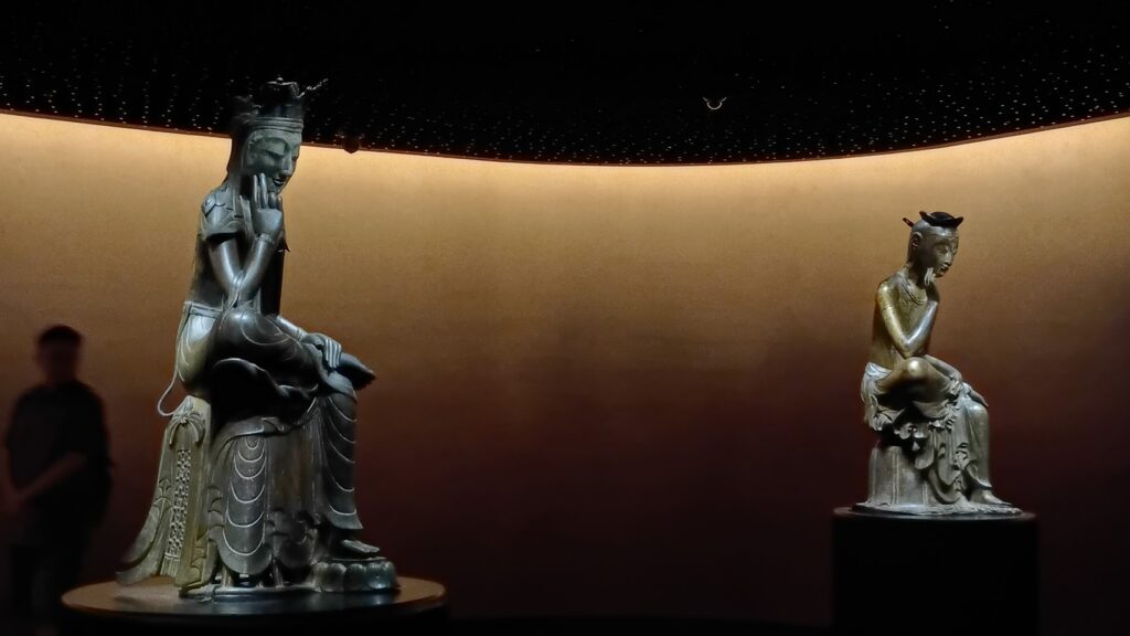 見た目もこちらの半跏思惟像とよく似ています。金色に輝く像は、この特別な空間で神秘的なイメージを漂わせていました。それにしても広隆寺の像は、光を極力落としたのか、暗くてよく拝見することができませんでした。漸く、明るい空間でそれが実現できました。