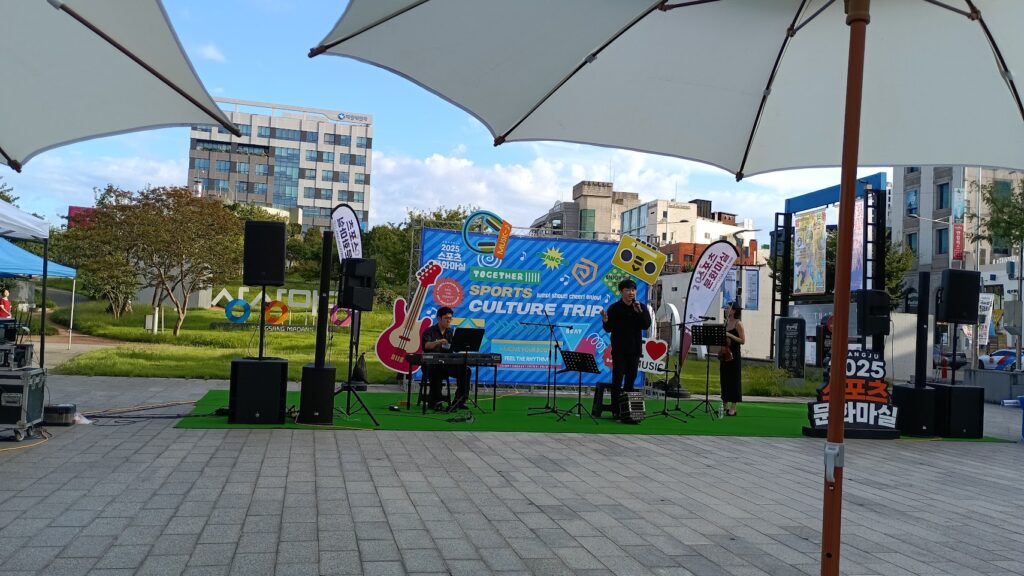 記録館を出て、旧道庁前広場にやって来ました。あいにく道庁だった建物は工事中で、その裏側に回ってみました。建物は国立アジア文化殿堂と呼ぶ音楽や美術等の公開・展示施設の一部となっており、美しく整備してありました。芝生の広場の一角でアコーディオンとピアノ、ヴァイオリンを奏でる若者がピアソラを演奏していました。椅子も用意されていたので、ここに陣取りしばし耳を傾けました。あれから45年、こちらも年取りましたが、この街も大きく変わったのでしょう。平和であることの重みを感じました。