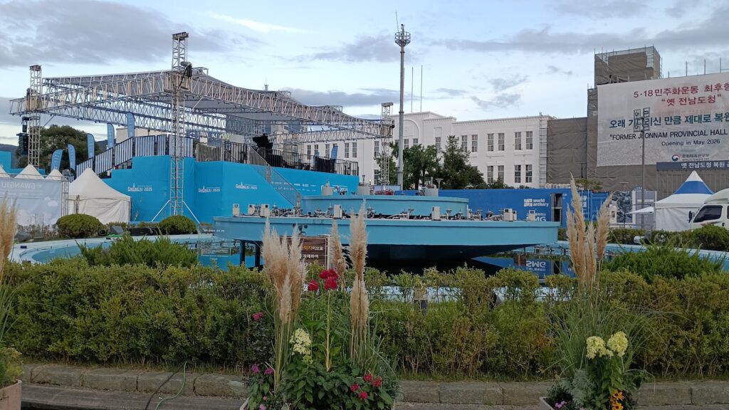 光州市の旧道庁広場は、12日行われるアーチェリー世界選手権の決勝会場を構築中