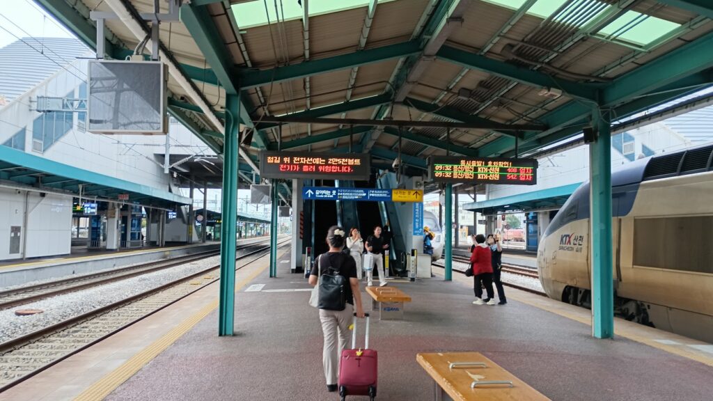 益山の駅で乗り換え 右側にKTXの車両 表示は英語以外殆ど全てハングルの表記