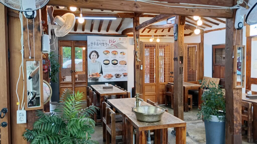 全州は李氏朝鮮の初代、李成桂(い・さんげ)の祖先の地として知られます。市街地の南部には、その古都の面影を残す全州韓屋村や李成桂の御真影が置かれた慶基殿(きょんぎじょん)があります。駅からは数キロ。バスで向かいました。バス停からしばらく歩くと、瓦で覆われた石塀が続く、慶基殿の一角に着きました。辺りを行く家族連れが、チマチョゴリを着たコスプレ姿のご一行。いかにも観光地に来た風景です。塀を右周りにぐるっと回って、まずは新装の観光案内所に寄りました。慶基殿の入場は、日本語の案内が付く午後2時が良いとのことで、その前に隣接する韓屋村を逍遥しました。その地区に伝統家屋が600棟あると言います。ただし、これらの建物は、多くが韓国の伝統様式で新たに建てられた物が多く、日本人好みのワビ・サビとは縁がないようです。その上、建物が密集せず明るい。梢の低い松の並木が目立ちました。歩いている中に、お腹がすいて来ました。この地区は、料理も伝統料理が食べられると聞きました。