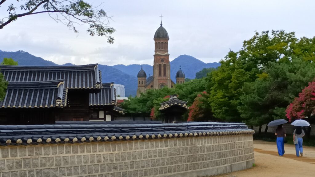 それにしても、こんな伝統家屋のすぐそばにキリスト教の教会があるのが、韓国の姿です。全州のカトリック教の大聖堂、殿洞聖堂が慶基殿の向かい側に、美しい塔屋を左右に控えて建っていました。公園のような広い敷地をもち、教会グッズの売店まで備えてありました。