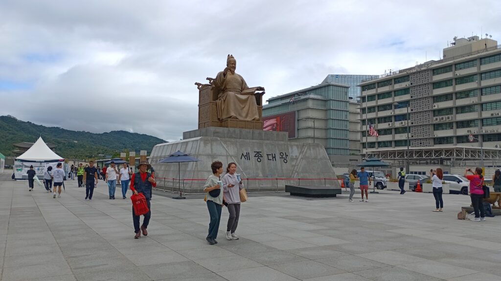 この日は昼過ぎから、ソウルを東西に流れる大河、漢江を渡って直ぐの永登浦(よんどんぽ)区に住む昔からの友人、Y氏と会う予定でした。午前の時間を使って、李朝の王宮、景福宮(きょんぼっくん)へと出かけました。ところが、まさかの火曜閉館。そこで、この宮殿へと南から真っ直ぐ伸びる大通り世宗(せじょん)大路を、宮を背にして南へと歩いて見ました。以前とは異なり、この大路は車道を大幅縮小し、歩行者用の緑地や広場に転換させ、気持ちの良いプロムナードとなっていました。大路の真ん中に世宗の大きな坐像がありました。近づいて見ると、その博物館の入口があり入ってみると、地階に広く、世宗を紹介する展示館があり、しばしこれを見学。朝鮮では誰もが認める偉大な君主、世宗は、ハングルを創始した王様です。ハングルは世界随一の合理的な成り立ちの文字だそうですが、その生まれた経緯からすると、日本人が漢字から平仮名、片仮名を創造したことに相似して、漢字からハングルが生まれた側面もあるのでは、と思いました。両者ともに表音文字ですね。